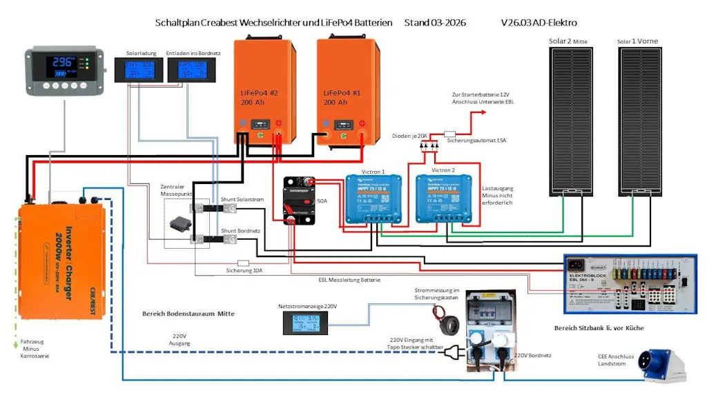 Ich nutze nun schon im dritten Jahr die 200Ah LiFePO4 Batterie von Creabest mit voller Zufriedeheit. In 03-26 kam nun die zweite Batterie neu hinzu und der 2000W Wechselrichter/Ladegerät. Auch hier wieder top Lieferung und alle Teile machen eien hochwertigen Eindruck. Der Einbau hat zu einem kompletten Neuaufbau der Versorgungselektrik geführt, bin aber Kfz-Elektromeisterin, den einiges erfordert schon Fachkenntnisse und hochwertige Verarbeitung/Montage (siehe Schaltplan und Bilder). Jetzt bin ich auf die Nutzung gespannt. In Kombi mit Victron Laderegler sind die Batterien bereits bei schlechtem Wetter schon beide zu 100% gefüllt. Die Neuanschaffungen habe ich nicht bereut und würde sie weiter empfehlen.